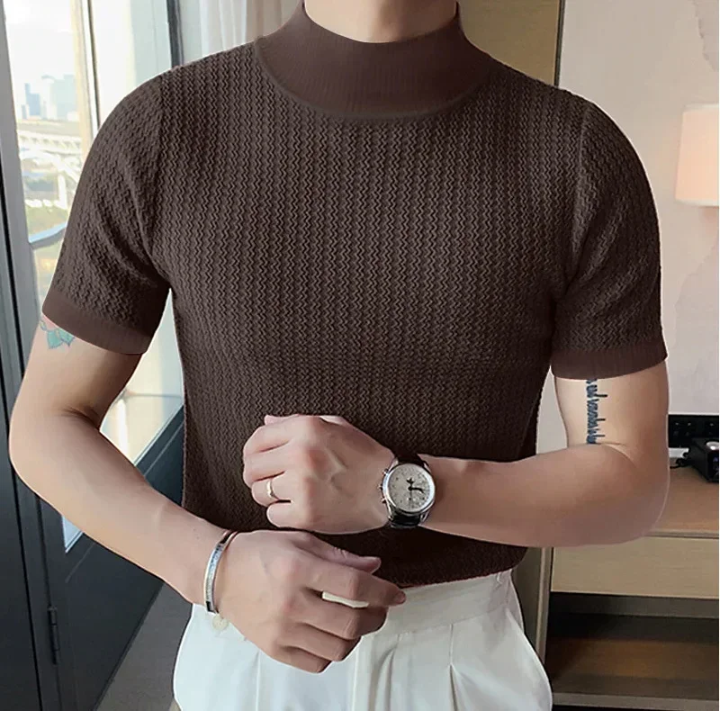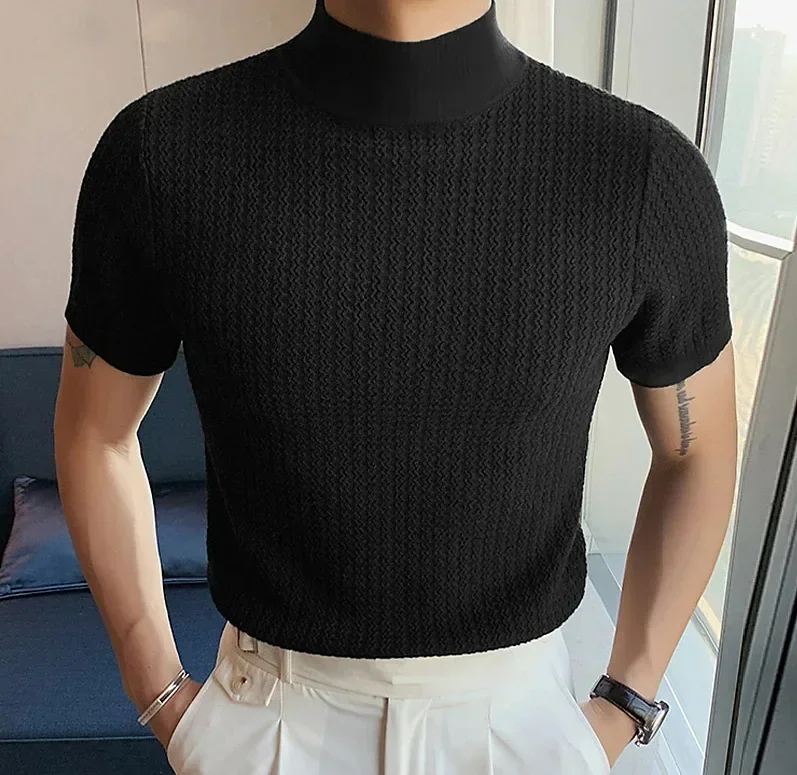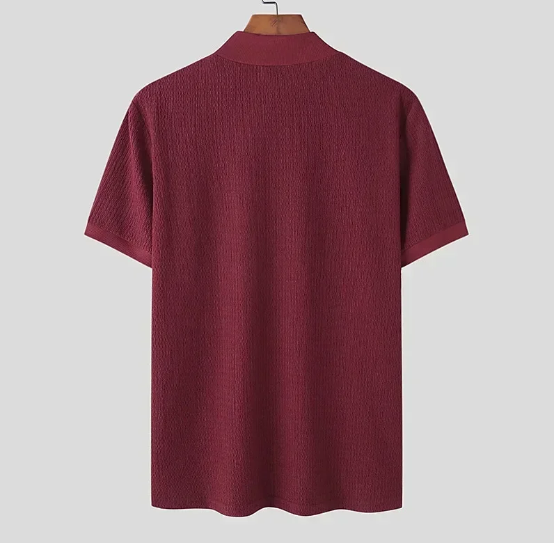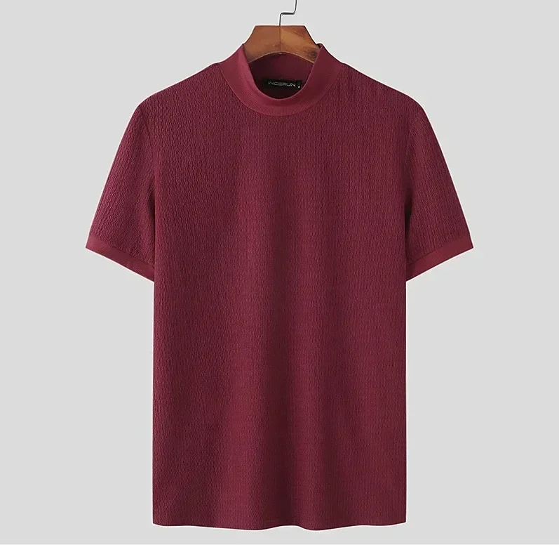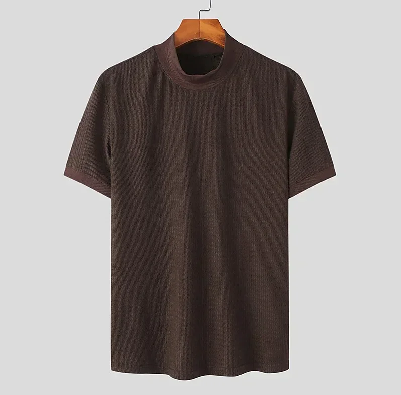 Upgrade your summer style with this modern men's high neck knitted T-shirt. Designed with a unique water ripple solid texture, it brings a touch of elegance while keeping a casual and comfortable vibe. Made from high-quality polyester fiber, the fabric is lightweight, breathable, and soft against the skin, perfect for hot days.